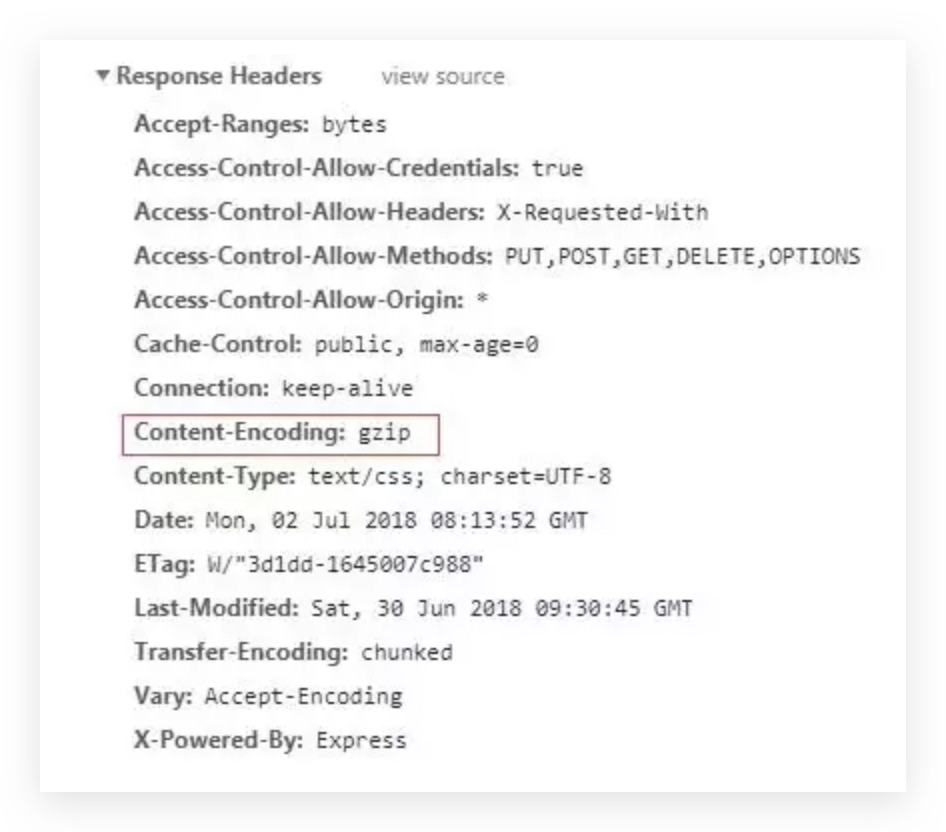 - 重启服务,观察网络面板里面的 response header,如果看到如下红圈里的字段则表明 gzip 开启成功 :