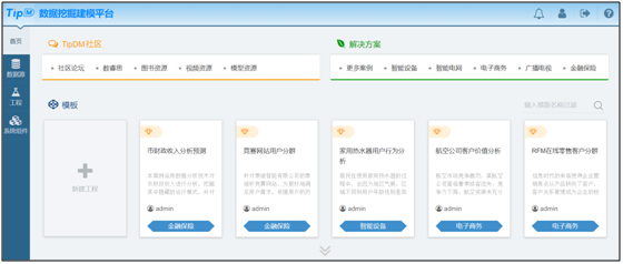 【模板】主要用于常用大数据挖掘案例的快速创建和展示。通过【模板】,用户可以创建一个无需导入数据及配置参数就能够快速运行的工程。同时,用户可以将自己搭建的数据挖掘工程生成为模板,显示在【首页】,供其他用户一键创建。