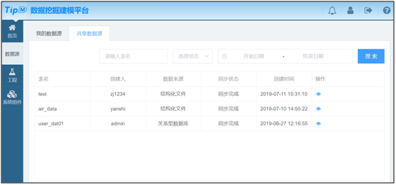 数据上传成功后,用户可以使用数据分享功能,如图5所示,将搭建工程涉及到的数据分享给其他用户。其他用户可在【共享数据源】内查看到分享给自己的数据,如图6所示,并使用该数据进行分析挖掘。