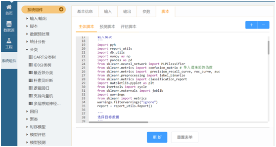 (4) 提供十大类数十种算法组件,包括数据预处理、统计分析、分类、聚类等常用数据挖掘算法。同时提供Python脚本与SQL脚本,粘贴代码即可运行。