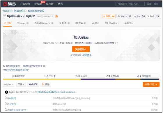 通过开源TipDM数据挖掘建模平台官网(python.tipdm.org),如图9所示,进入Github或码云开源网站,如图10所示,同步平台程序代码到本地,按照说明文档进行配置部署。