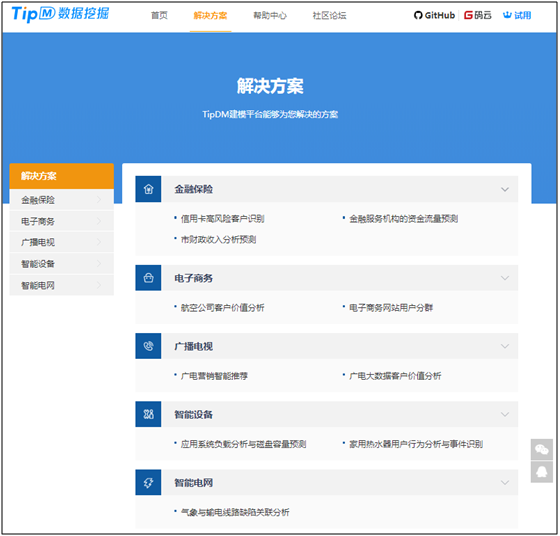 平台官网提供了数量丰富的不同行业的解决方案,主要介绍使用平台搭建数据挖掘工程的不同行业的案例,包含【电子商务】【智能设备】【金融保险】等,如图11所示,用户可以根据步骤提示,动手搭建数据挖掘工程。
