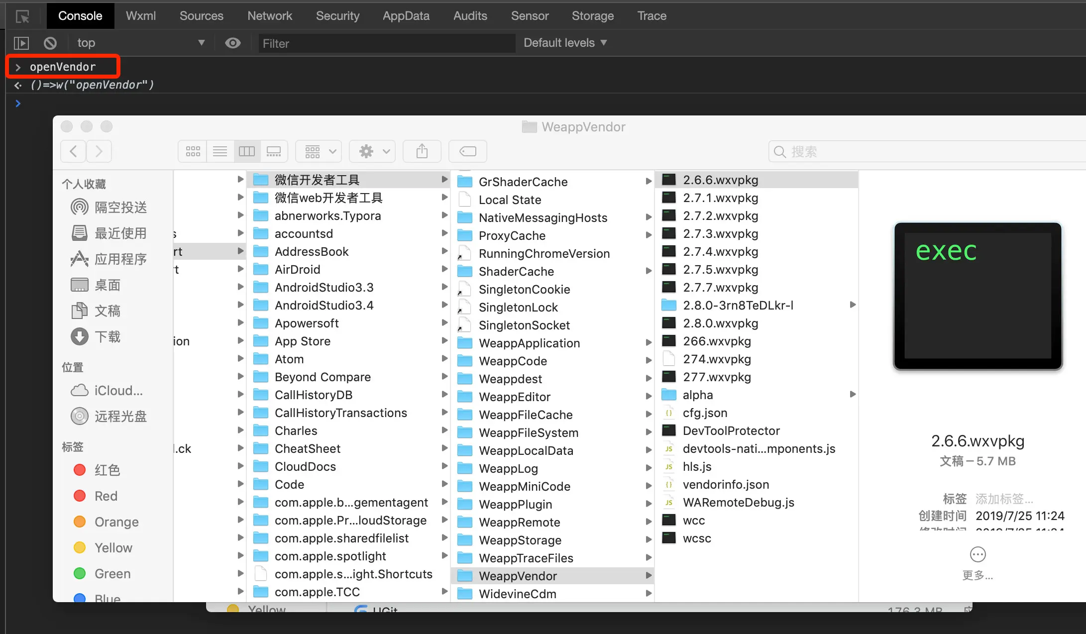 - 在微信小程序 IDE 控制台输入 openVendor 命令,可以打开微信小程序开发工具的资源目录