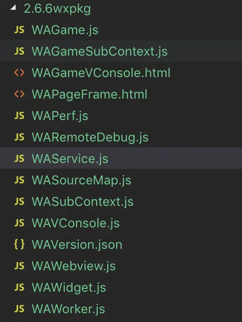 - 我们可以看到小程序各版本的运行时包 .wxvpkg。.wxvpkg 文件可以使用 wechat-app-unpack 解开,解开后里面就是WAService.js 和 WAWebView.js 等代码