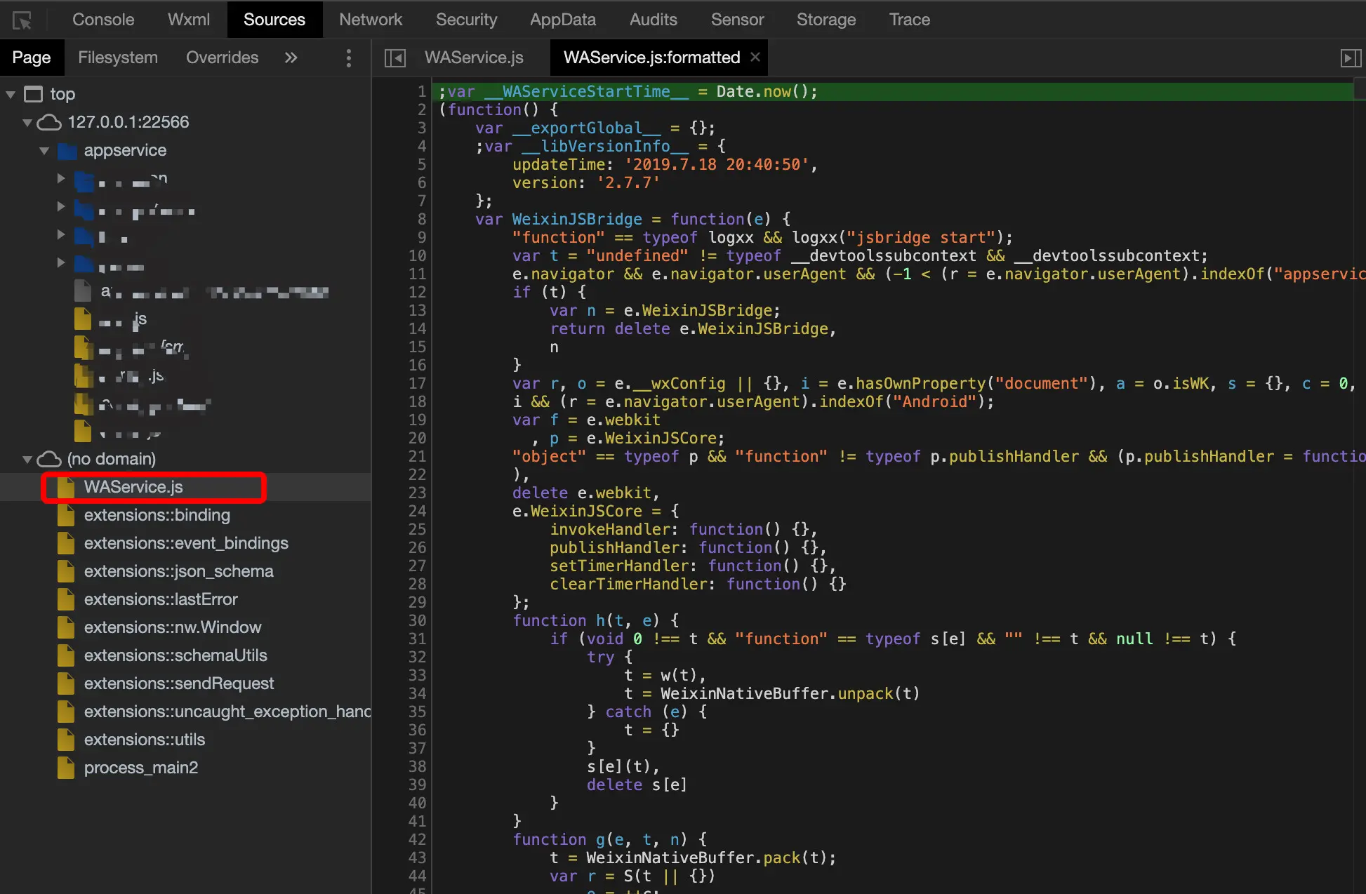 - 另外也可以只直接通过开发者工具的Sources面板查找到WAService.js的源码