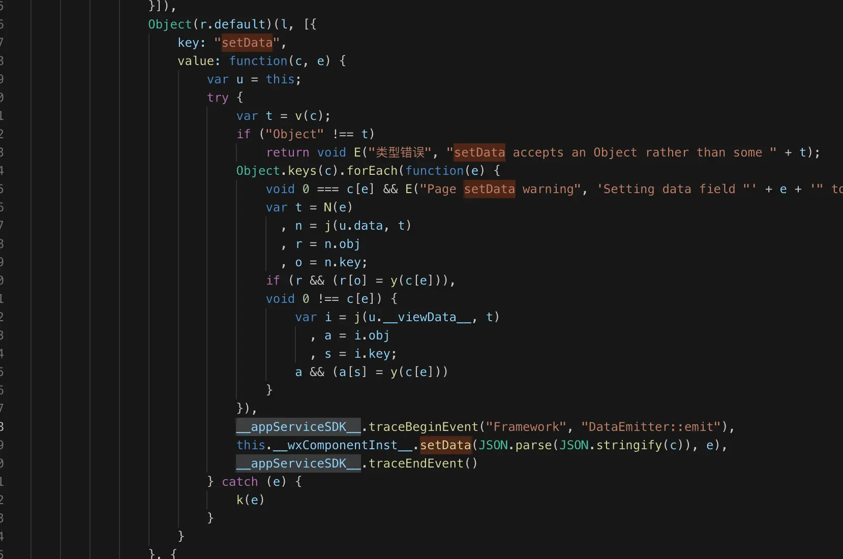 - 在WAService.js中全局查找setData方法,找到定义此方法的地方,如下