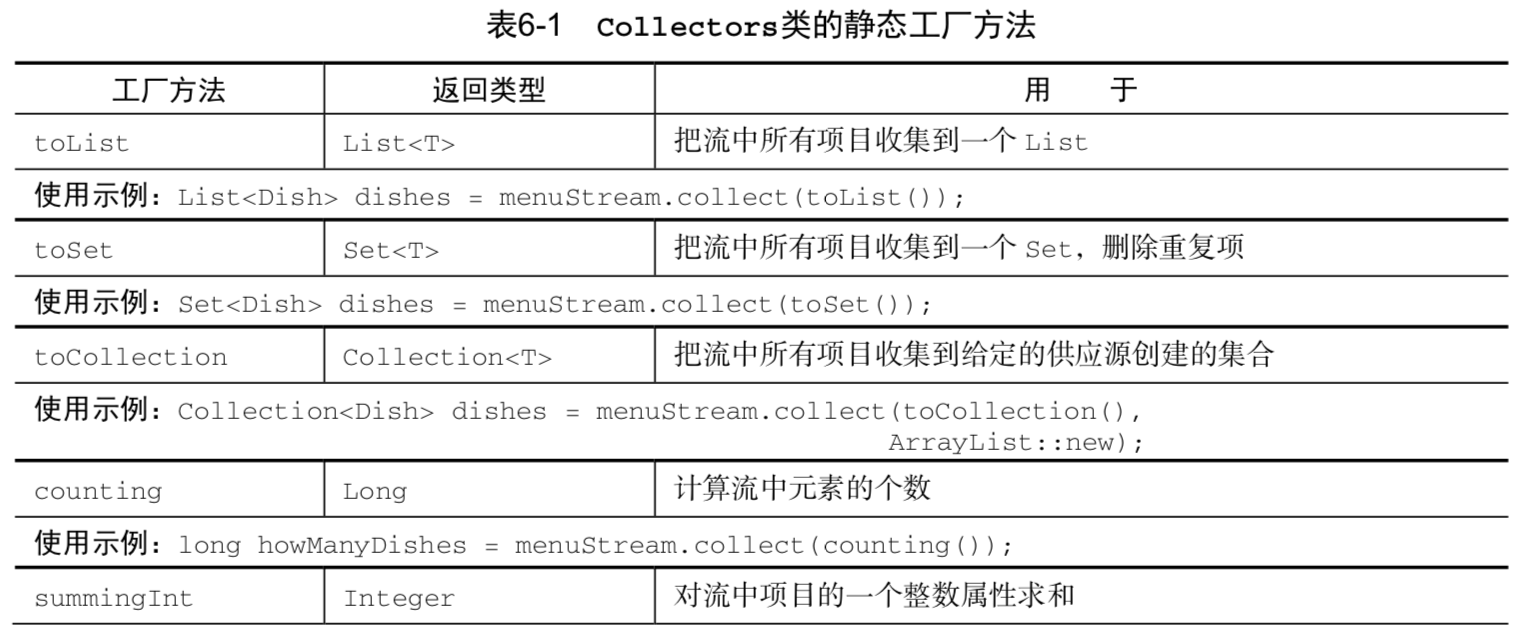 - 预定义收集器包括将流元素归约和汇总到一个值,例如计算最小值、最大值或平均值。这些收集器总结在表6-1中。
