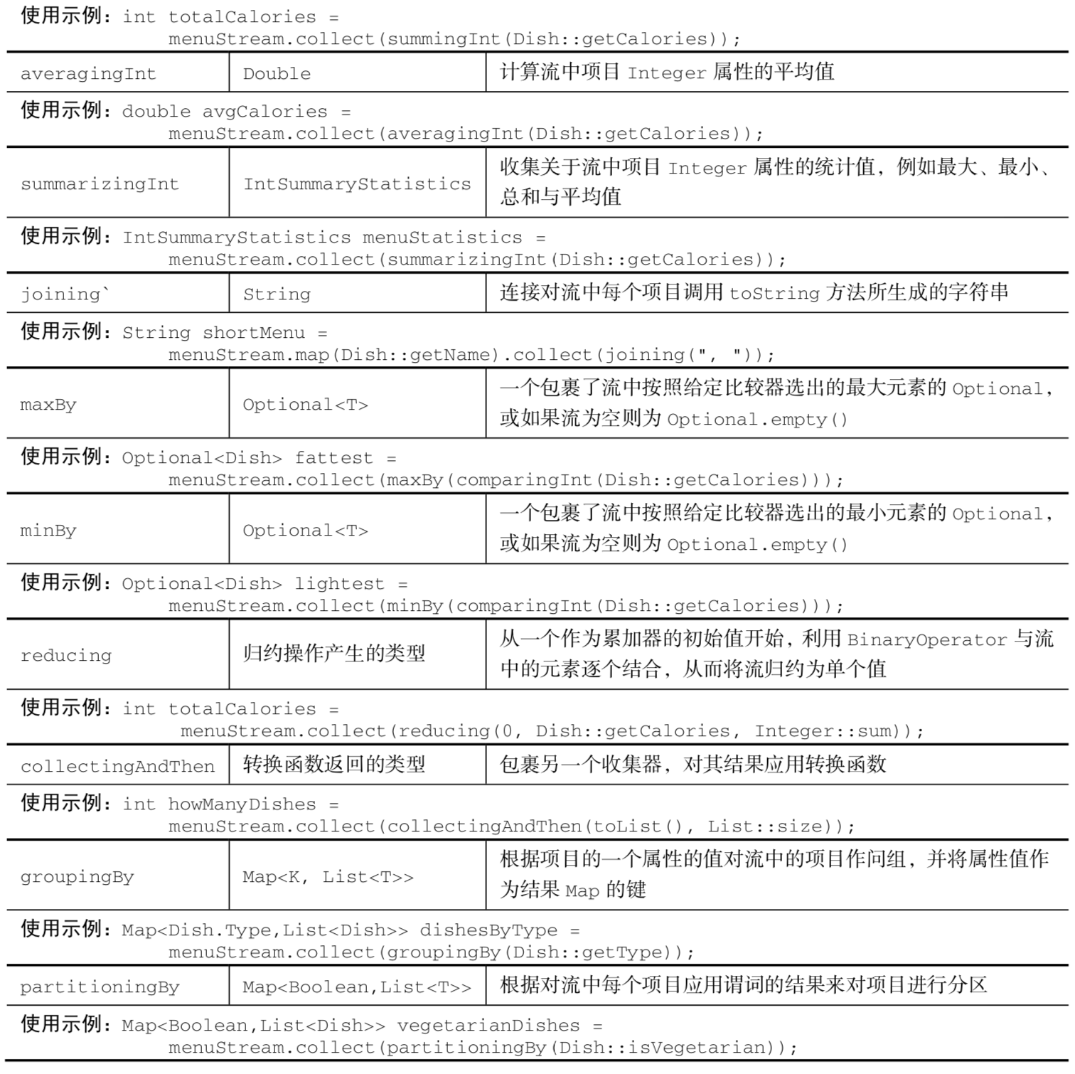 在需要将流项目重组成集合时,一般会使用收集器(Stream方法collect 的参数)。再宽泛一点来说,但凡要把流中所有的项目合并成一个结果时就可以用。这个结果可以是任何类型,可以复杂如代表一棵树的多级映射,或是简单如一个整数。