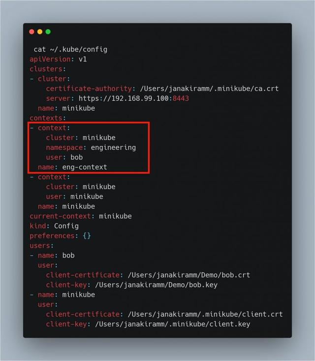 kubectl config set-context eng-context \ --cluster=minikube \ --namespace=engineering \ --user=bobContext "eng-context" created.上面的命令使用Bob在minikube集群中的凭据创建了一个指向engineering命名空间的新上下文。这会导致在〜/ .kube / config文件中添加一个新的部分。