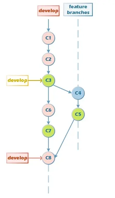 个人觉得这个图还是挺有代表性的,主分支develop,在这个分支上我切出了自己的分支,就叫feature吧,简单来理解,就是自己在自己的feateure上提交了一些东西,这个时候,你的队友在主分支上也提交了一些东西,这个时候就会出现两个commit,主分支会新有一个commit来把子分支上的两个commit合并。这时候提交的形状就不是一条直线。