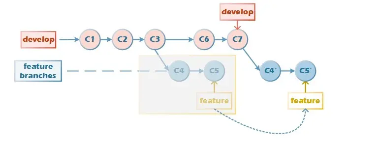 rebase会把你当前分支的 commit 放到公共分支的最后面,所以叫变基。就好像你从公共分支又重新拉出来这个分支一样。你现在从主分支master拉一个feature分支出来,主分支又提交,当你开发完commit时,就会就会把你当前的几个 commit,放到那个人 commit 的后面。