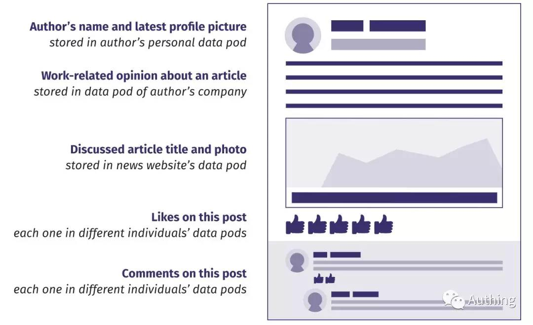 这种思考产生了个人数据库的概念,我们可以在其中存储我们生成的每一条信息。如下图所示,这个陈述可以完全按照字面意思进行:即使是一个看似微不足道的数据,比如我们提供某个网页或者东西的简单数据,也可以存储在我们自己的 pod 中。虽然这种程度的去中心化可能看起来极端,但回想一下,即使是所谓的微不足道的喜欢也可以揭示更深层次的个人信息,因此让人们控制它们是有道理的。此外,由于我们不依赖任何人的许可在我们自己的 pod 中发布数据,因此我们可以将点赞,注释和评论放在我们想要的任何内容上,而不用担心它们会被审查或删除。