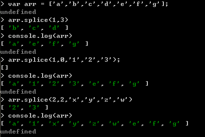 - 插入:arrayObject.splice(index, 0, item1,……,itemX) 在指定的位置插入值,index:起始位置,0:要删除的项数,item1……itemX:要插入的项