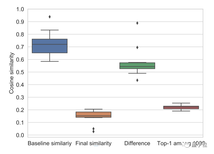 蓝色,是一个人戴上普通帽子前后,AI判断的类别相似度,在70%上下。(判断类别一致,就是人类没变。)