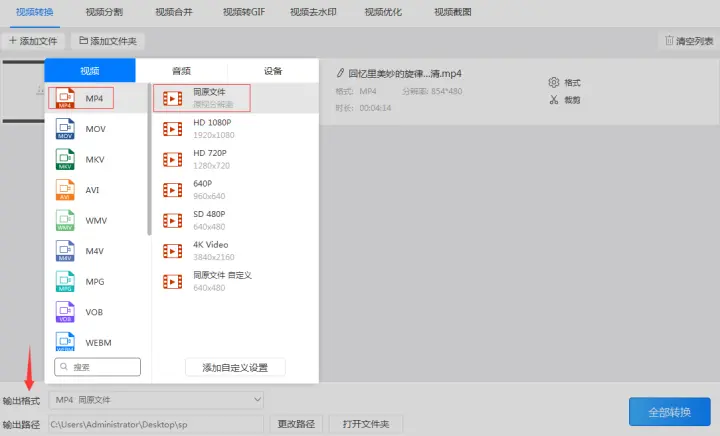 2、在软件左下角选择视频要输出的视频格式和视频分辨率。这里首先把输出的视频格式设置为需要的mp4格式,然后把输出的视频分辨率保持为和avi相同分辨率的同原文件格式。