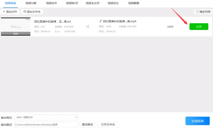 5当格式已经转换好后点击覆盖在“转换”按钮上的“打开”按钮或者找到之前在输出路径中预设好的输出路径就可以找到转换后的mp4格式的视频了。