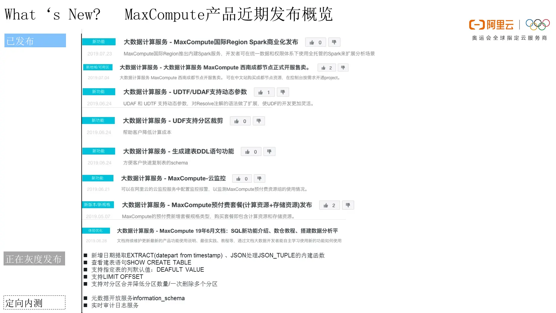 本次所要介绍的MaxCompute产品近期的发布情况主要包括三个部分,首先是近几个月已经陆续发布上线,并且产品文档已经完备的功能,希望希望通过本次介绍让开发者能够更好地了解这些新的功能;其次是目前MaxCompute在线上所正在做的大版本升级中已经实现的一批灰度升级项目,本次也会对于其中一些比较成熟的功能进行分享;最后就是一些即将面向更大规模的用户进行发布的功能,也就是目前还处于定向内测阶段的功能。