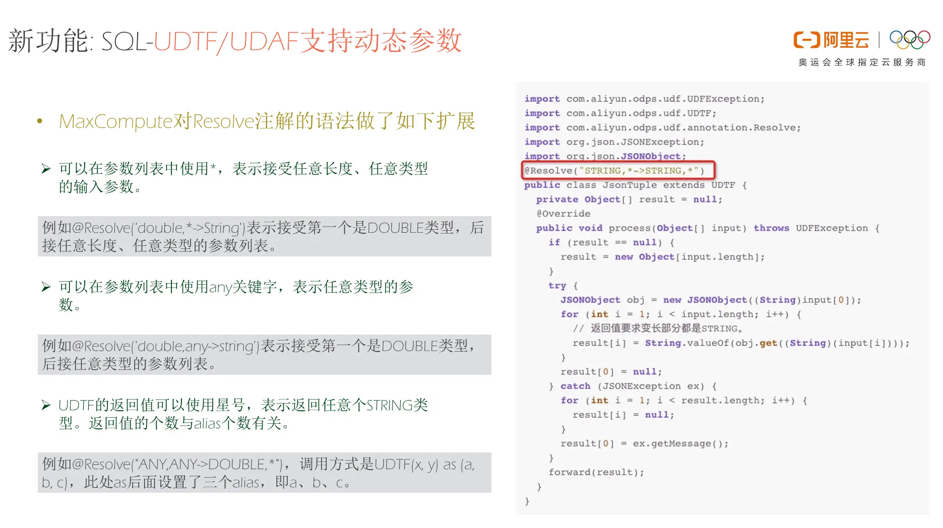 新发布的MaxCompute版本的SQL能够支持UDF相关的动态参数。如下图中的代码所示,其中含有一个命名为JsonTuple的UDTF。这里JsonTuple的业务需求就是首先读取一个JSON串,其中包含了一系列JSON内容,并且需要解析其中某些节点的信息。