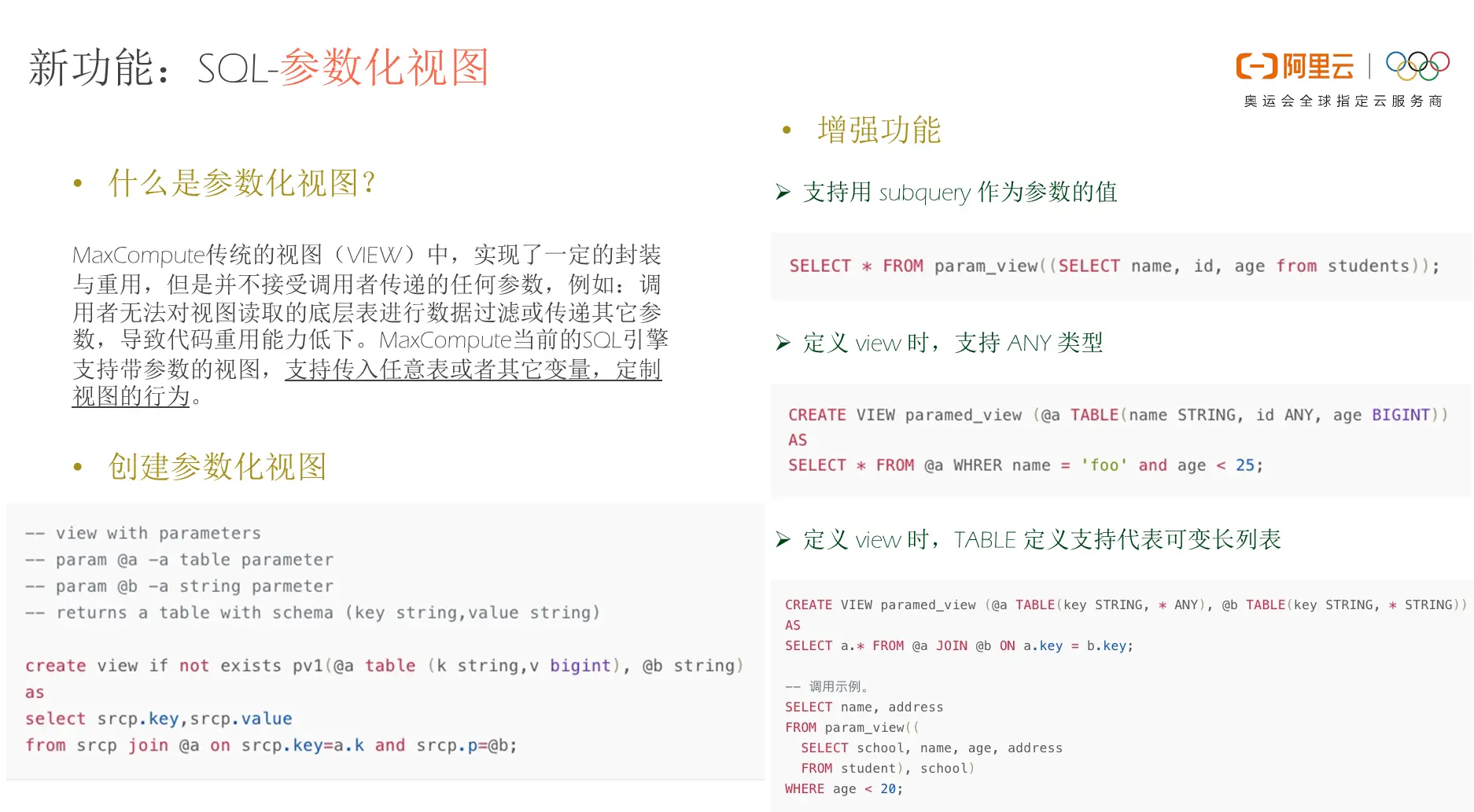 MaxCompute近期发布上线的版本围绕着SQL核心功能的一些细节做了大量的优化和提升,其中一点就是参数化视图。MaxCompute传统的视图(VIEW)中实现了一定的封装与重用,但是并不接受调用者传递的任何参数,例如:调用者无法对视图读取的底层表进行数据过滤或传递其它参数,导致代码重用能力低下。MaxCompute近期发布上线的版本的SQL引擎支持带参数的视图,支持传入任意表或者其它变量来定制视图的行为,从而增强了视图的可用性和复用度。