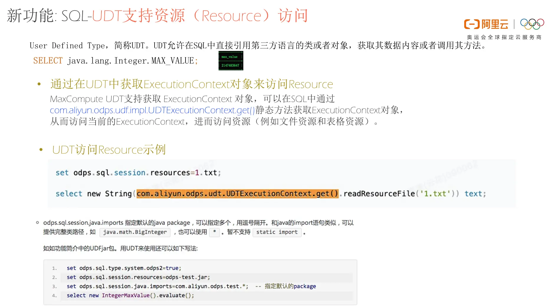 User Defined Type,简称UDT,它属于最近几个版本MaxCompute的SQL里面推出的比较新的功能,目前应用也不是非常广泛。UDT是MaxCompute 2.0之后主张使用的NewSQL能力,其允许在SQL中直接引用第三方语言的类或者对象,获取其数据内容或者调用其方法。目前,MaxCompute的SQL中的UDT提供的是对于Java UDT的支持。举例而言,如果想要在MaxCompute中获取整数中的最大值,通常需要自己写一个UDF函数并通过其他语言实现出来,而其实在像Java这样的高级语言中的一些内置方法就能够实现,因此可以简单地使用Select Java库中的一个方法来获得相应的能力。这是之前所发布的UDT本身的能力,而今天要发布的新特性则是UDT对于MaxCompute中资源访问的支持。MaxCompute中有很多种对象,其中一种就是资源,比如一些数据文件。MaxCompute可以使用SQL通过Resource读取文本文件,也可以通过Set参数的方式将自定义的JAR作为UDT能够直接访问的一个库,并在UDT当中使用用户自定义的第三方库。