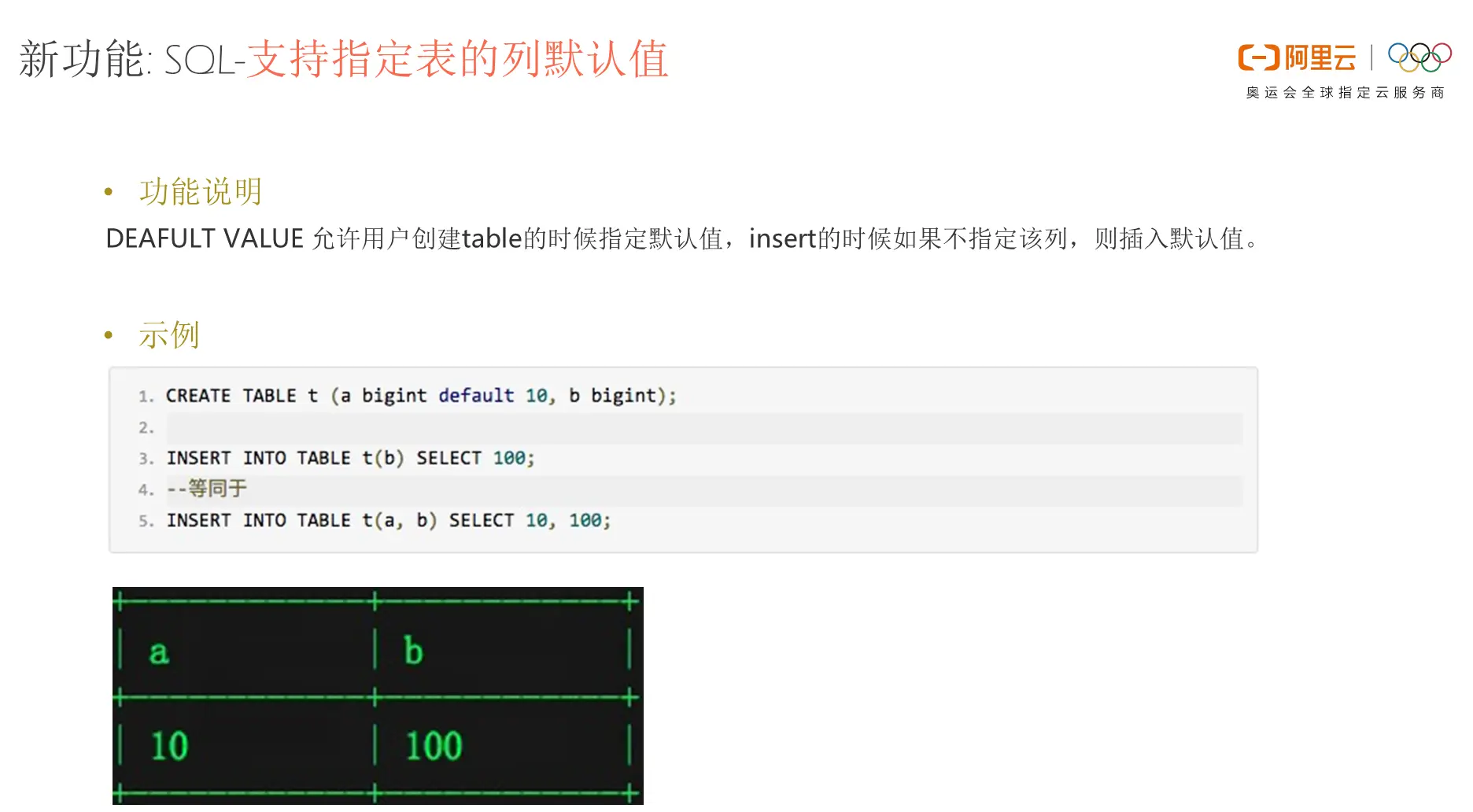 在上图的代码示例中,创建了一个表T,表T中包含了a、b两列,这两列的数据类型都是bigint,并且a的默认值设为10。当向这个表中插入数据记录并且只对于字段b进行插数据的时候,MaxCompute会自动地在结果当中将a的值按照默认值补齐,其等效于同时在a列中插入10并且在b列中插入100。这样的功能在很多场景下用处还是比较大的,比如某些字段默认设置为0或者为空的情况。