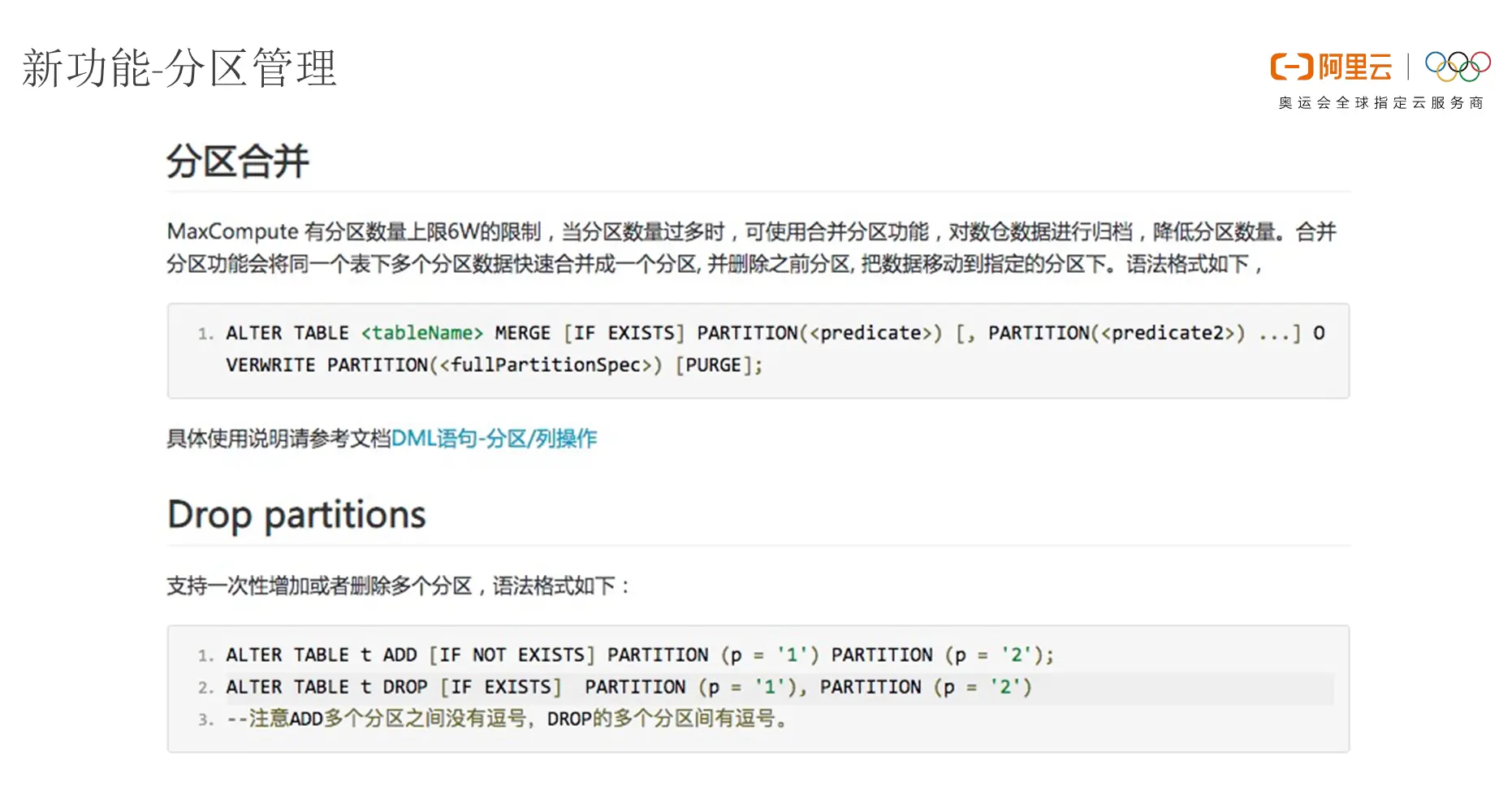 除了前面提到的MaxCompute在SQL中的一些增强功能之外,新版本的MaxCompute还提供了一些其他的能力,比如分区管理的能力。在分区管理部分,一个比较重要的场景就是由于开发者往往喜欢使用较多的分区,而当数据量大的时候可能会造成多级嵌套分区,因此表的分区数量就会非常庞大。而MaxCompute本身对于分区数量存在一个上限,当数据分区过多的时候就需要将历史过往的分区进行合并,并且删除不必要的分区。