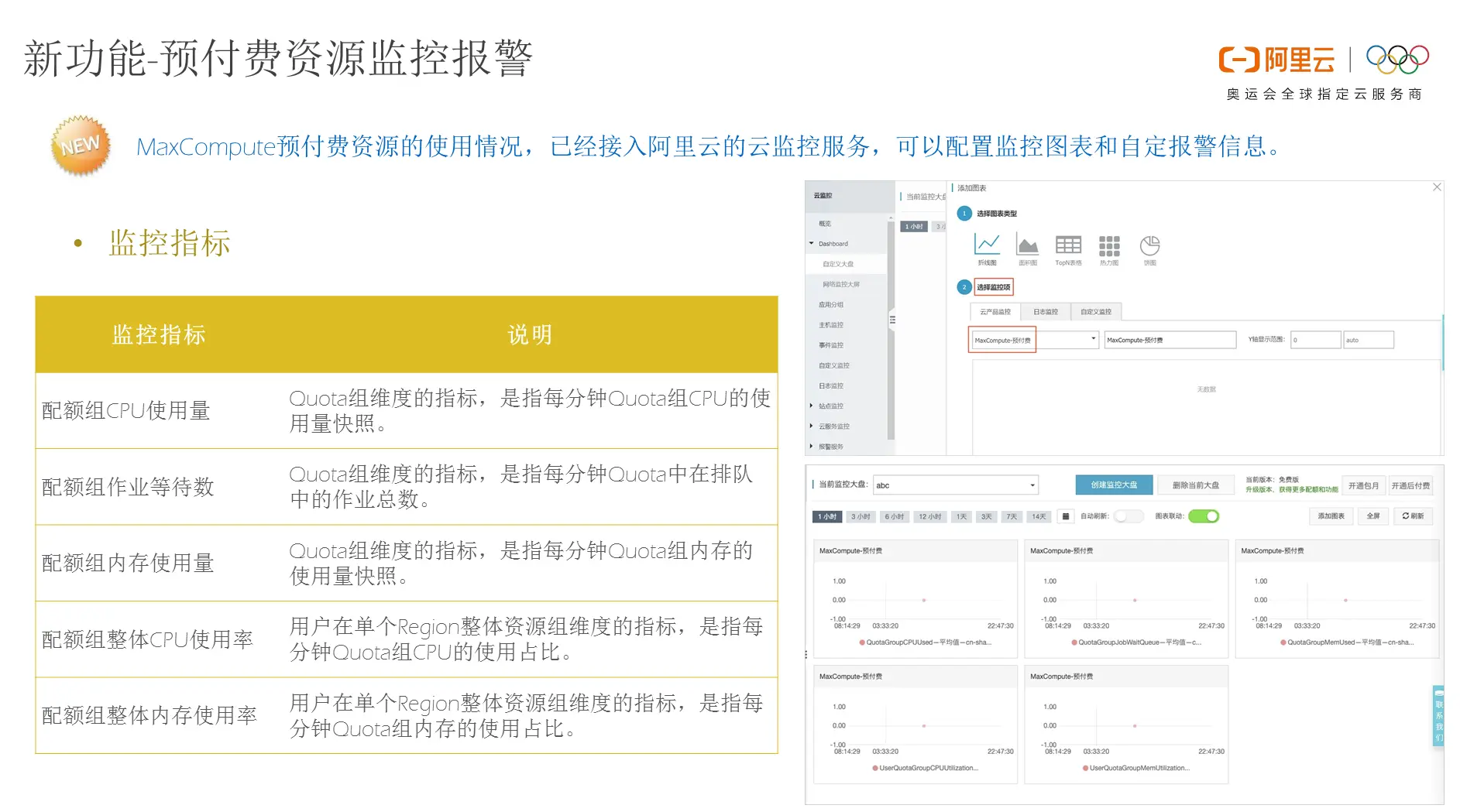 MaxCompute所提供的预付费资源监控报警能力基于阿里云所提供的云监控服务,并且结合了配额组CPU使用量、作业等待等待数、内存使用量、整体CPU使用率等一些关键指标,通过对以上这些指标进行规则配置,就能实现对于关键事件的短信通知以及实时告警,从而帮助用户更好地管理和使用资源。
