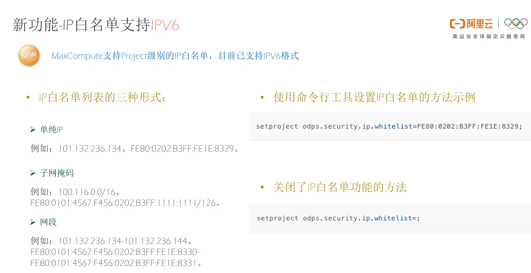 目前,IPV6已经成为阿里云整体都会支持的能力,而MaxCompute本身也支持了IPV6。对于IP白名单这个安全特性而言,过去MaxCompute支持IPV4,目前也扩展支持了IPV6,使用方式与原本的IPV4差异不大,通过白名单列表的设置就能够同时支持IPV4和IPV6。