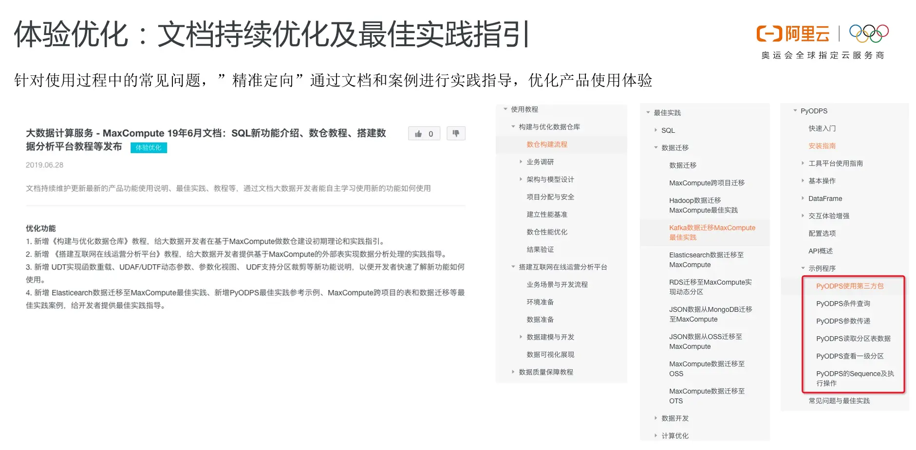 这些文档包含了如何基于MaxCompute构建和优化数据仓库,同时也提供了一些数字化运营的具体案例,比如如何基于MaxCompute搭建互联网在线的运营分析平台。此外,因为Python生态广受欢迎,开发者也是人数众多,因此PyODPS也受到了很多Python开发者的支持,通过前一个阶段的反馈,MaxCompute团队也发现PyODPS在文档方面存在一些不足之处,因此近期也做了专项整理。MaxCompute团队整理了PyODPS的一些指导文档和具体示例,大家可以到官网上去查看最新发布的指导文档和案例。