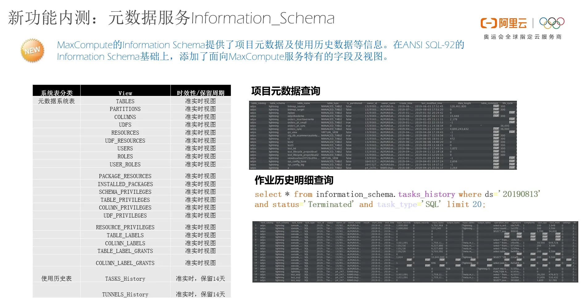 前面分享的是MaxCompute新版本中的一些线上可用的功能,而在实际上还有一些功能目前处于内部定向邀请测试阶段,这些功能也是社区中很多开发者以及企业客户所非常看重的功能。这里为大家介绍两个处于内测阶段的功能,其中第一个就是元数据服务。MaxCompute本身是一个多租户的系统,用户使用的时候非常希望将更多的数据以更加友好的方式开放给使用者,能够帮助使用者自助地了解项目中的一些信息,其中比较常见的就是元数据信息,比如Table、Partition、Column、UDF、Resource、User等信息。以往这些信息都是通过命令的方式获取,但是当元数据量非常大的时候,很难通过这种方式去获得或者检索和过滤信息。而在传统的数据库技术领域有非常多的解决方案,因此MaxCompute中也提供了Information_Schema这样的一套服务,在遵循规范的基础之上也添加了一些MaxCompute特有的视图和字段,既能够满足开发者原有的一些使用习惯,也能够更好地结合MaxCompute本身的一些特点。