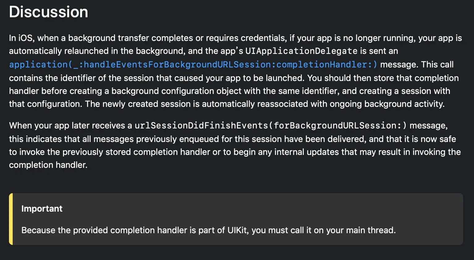func application(_ application: UIApplication, handleEventsForBackgroundURLSession identifier: String, completionHandler: @escaping () -> Void) {
