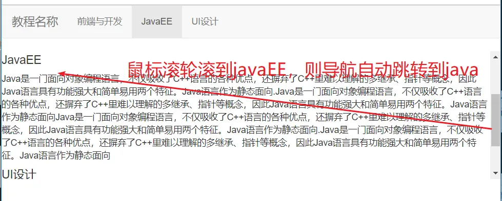 01 02 03 04 05 06 07 08 09 10 11 12 13 14 15 16 17 18 19 20 21 22 23 | <div data-spy="scroll" data-target="#myScrollspy" data-offset="0" style="height:200px;overflow:auto; position: relative;"> <h4 id="qianduan">前端与开发</h4> <p>前端开发是创建Web页面或app等前端界面呈现给用户的过程。前端开发通过HTML,CSS及JavaScript以及衍生出来的各种技术、框架、解决方案,来实现互联网产品的用户界面交互 [1] 。它从网页制作演变而来,名称上有很明显的时代特征。在互联网的演化进程中,网页制作是Web1.0时代的产物,早期网站主要内容都是静态,以图片和文字为主,用户使用网站的行为也以浏览为主。随着互联网技术的发展和HTML5、CSS3的应用,现代网页更加美观,交互效果显著,功能更加强大。 </p> <h4 id="java">JavaEE</h4> <p>Java是一门面向对象编程语言,不仅吸收了C++语言的各种优点,还摒弃了C++里难以理解的多继承、指针等概念,因此Java语言具有功能强大和简单易用两个特征。Java语言作为静态面向.Java是一门面向对象编程语言,不仅吸收了C++语言的各种优点,还摒弃了C++里难以理解的多继承、指针等概念,因此Java语言具有功能强大和简单易用两个特征。Java语言作为静态面向Java是一门面向对象编程语言,不仅吸收了C++语言的各种优点,还摒弃了C++里难以理解的多继承、指针等概念,因此Java语言具有功能强大和简单易用两个特征。Java语言作为静态面向.Java是一门面向对象编程语言,不仅吸收了C++语言的各种优点,还摒弃了C++里难以理解的多继承、指针等概念,因此Java语言具有功能强大和简单易用两个特征。Java语言作为静态面向 </p> <h4 id="ui">UI设计</h4> <p>UI设计(或称界面设计)是指对软件的人机交互、操作逻辑、界面美观的整体设计。UI设计分为实体UI和虚拟UI,互联网说的UI设计是虚拟UI,UI即User Interface(用户界面)的简称。UI设计(或称界面设计)是指对软件的人机交互、操作逻辑、界面美观的整体设计。UI设计分为实体UI和虚拟UI,互联网说的UI设计是虚拟UI,UI即User Interface(用户界面)的简称。 </p></div> |