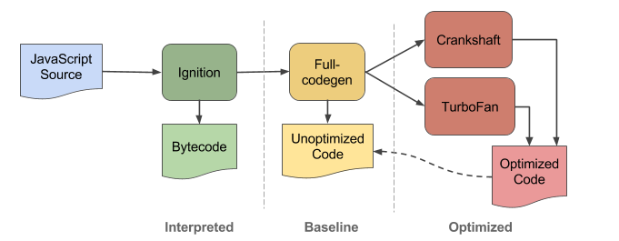 v8和其他现代js引擎在执行之前通过just-in-time compilation 脚本编译到本机机器代码来决定速度。代码最初由基线编译器编译,可以快速生成非优化的机器代码。编译后的代码在运行时进行分析,并可选择使用更高级的优化编译器动态地重新编译,以实现最佳性能。在v8中,此脚本执行通道具有各种特殊和条件,这些特殊情况和条件需要复杂的机制才能在基线编译器和两个优化编译器Crankshaft和TurboFan之间切换。