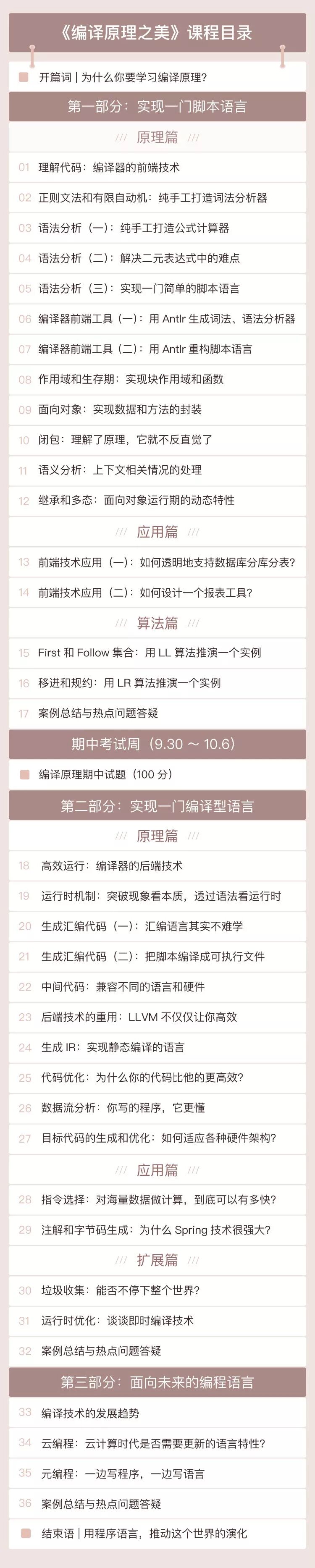 1分钟看看目录,跟市面上复杂的资料不同,内容精简到30多节,但涵盖的重点难点却一点都不少,就是为了能让你 更高效、清晰的学懂、落地实践编译原理。
