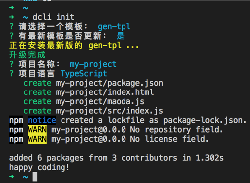 这些问询的结果,将影响我们最终的模板,比如我们根据是否 TypeScript 会在两套预设的模板中选一个套,将用户输入的「项目介绍」插入 package.json 的 description 字段等等