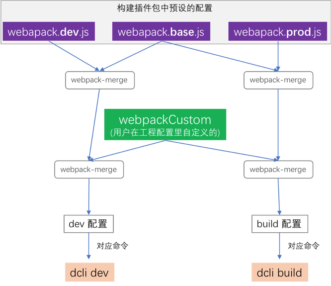 而 build-tpl 这个构建插件包,负责将内置的 webpack.config.js 与用户工程下自定义的 webpackCustom 进行 merge,然后执行 webpack 流程