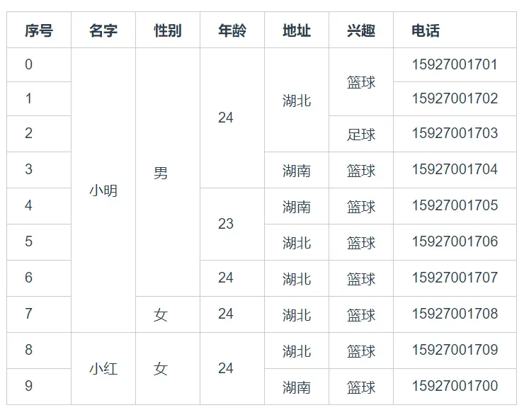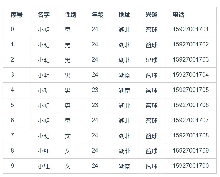 {name: '小明', sex: '男', age: '24', address: '湖北', habit: '篮球', tel: '15927001701'},