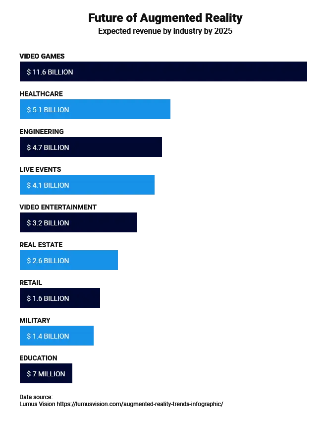 尽管游戏行业的盈利是最多的,但我们预计医疗和工程等更实用的行业具有更大的发展潜力。在房地产和家居领域,可以使用混合或虚拟现实技术来进行互动预演,也可以使用移动AR实现即时传递资讯。移动AR也可以用来推动旅游行业的发展,比如说,可以通过AR -power discovery来吸引和留住旅行者。在不久的将来,随着新的软件、硬件和应用出现在市场上,AR概念本身也将有所发展。