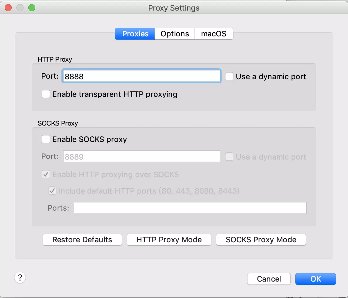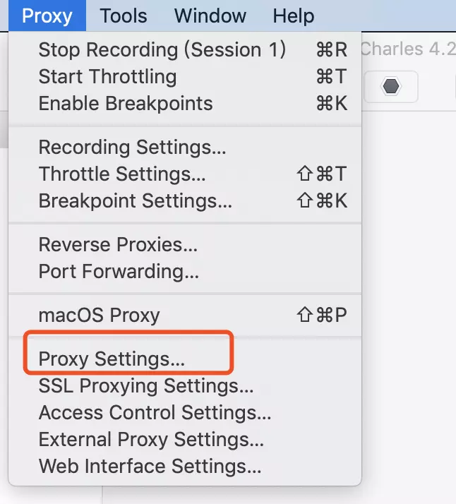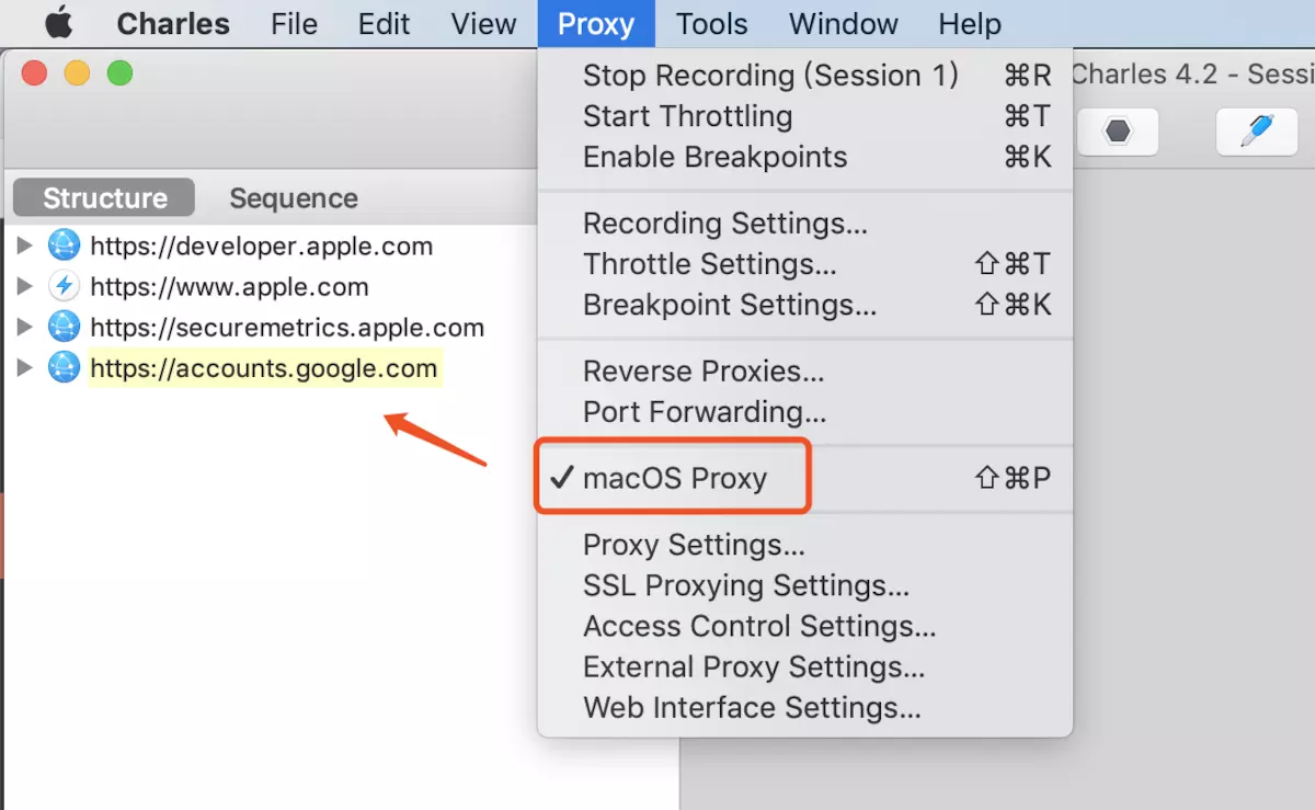 2、勾选macOS Proxy则是抓取PC端, 那么不够选则是在移动设备上抓包;