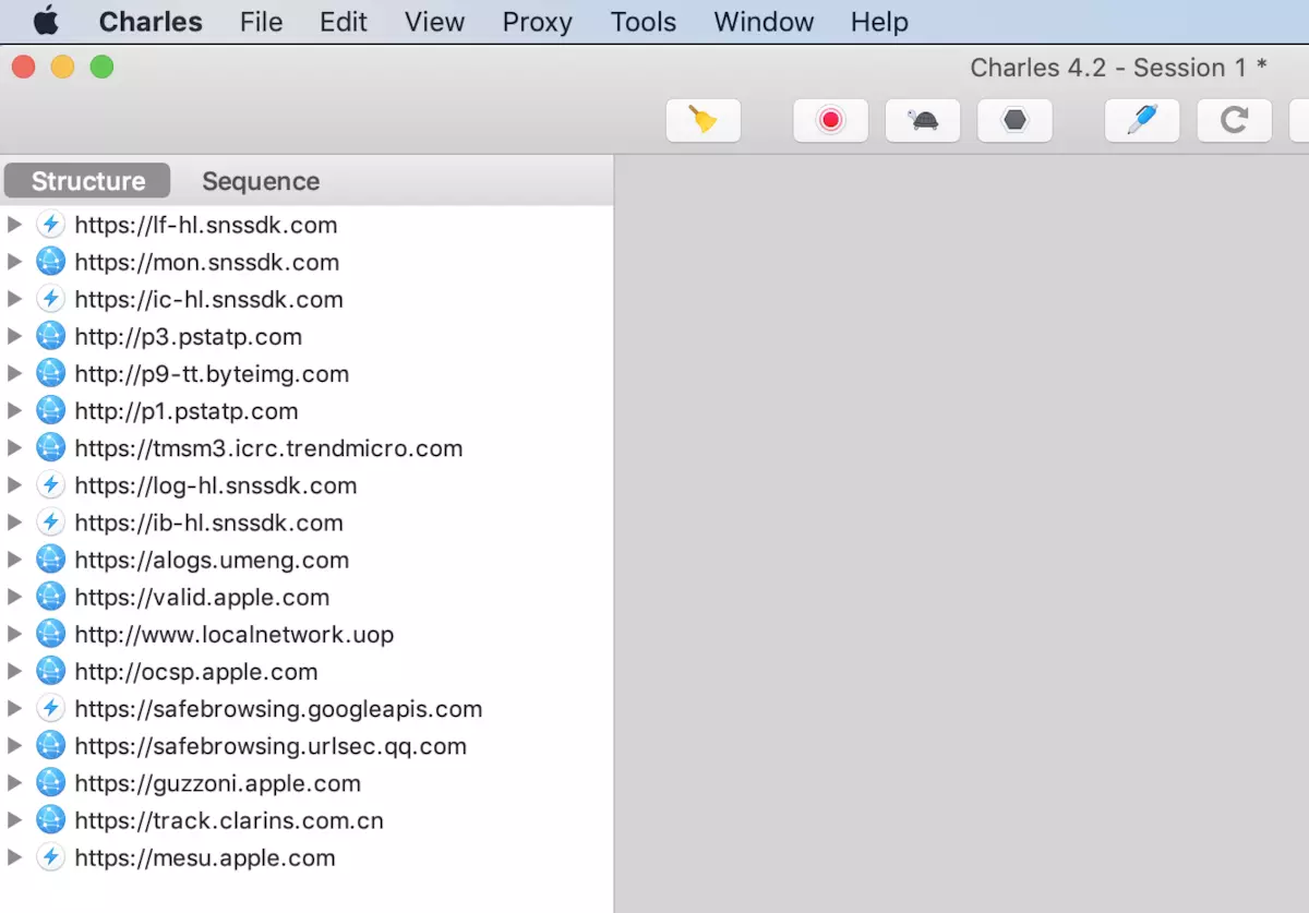 在配置iPhone代理完毕后,就可以通过Structure或者Sequence窗口预览HTTP请求的数据了。但由于HTTPS请求被加密过,预览请求时只能预览到乱码数据。要预览到HTTPS请求的数据明文,需要PC和iPhone安装证书授权。