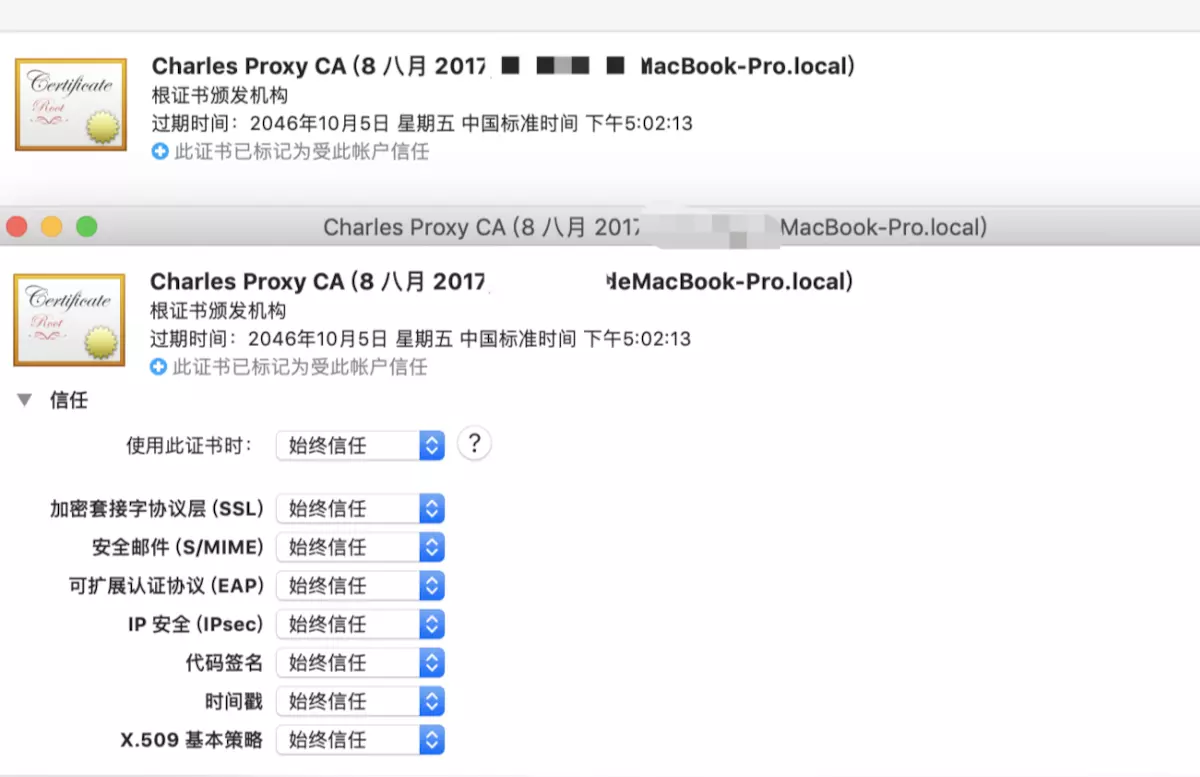 证书可以在Mac的钥匙串中查看,双击证书,将信任权限设定为始终信任。图示如下: