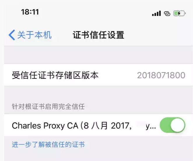 基于iOS的证书信任机制,在安装完成并信任证书后,需要到iPhone设置 -> 关于本机 -> 证书信任设置中启用根证书。图示如下: