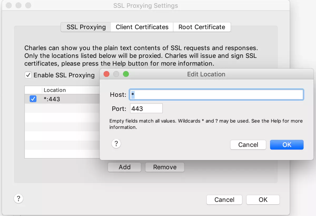 在Charles菜单栏 -> Proxy -> SSL Proxying Settings中勾选Enable SSL Proxying,然后在Locations中添加需要抓包的Host和Port即可。图示如下: