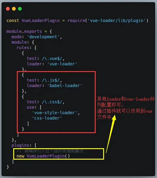 Vue Loader v15是通过插件VueLoaderPlugin将你定义过的其它规则复制并应用到 .vue 文件里相应语言的块。例如,如果你有一条匹配 /\.js$/ 的规则,那么它会应用到 .vue 文件里的 <script> 块。一个更完整的 webpack 配置示例看起来像这样: