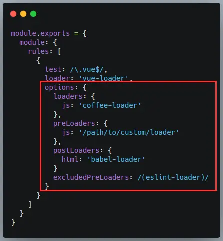 vue-loader中,其他loader的配置要作为该loader的选项(options)配置: - 其他具体的配置项这里就不列了,参看官网配置即可。