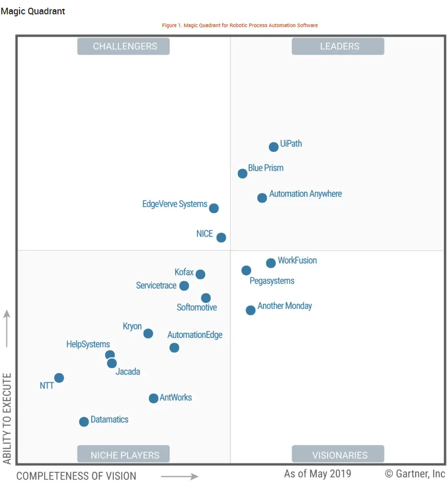 Blue Prism被Gartner公认为是首批将RPA描述为市场的供应商之一。它赞扬其营销执行,合作伙伴参与和强大的垂直化战略作为其优势。