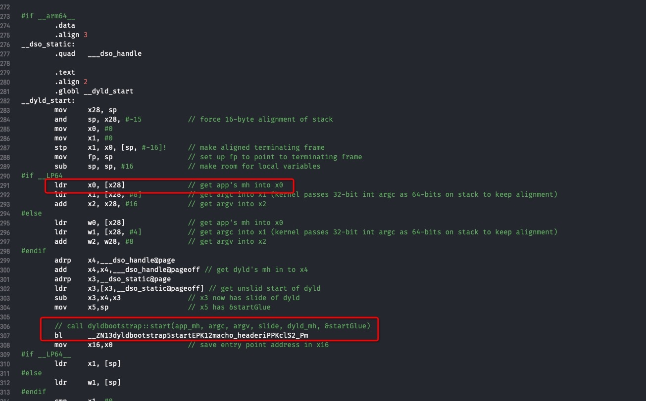 在 dyld 源码里找到dyldStartup.s找到了__dyld_start,这里只截取了arm架构的部分.