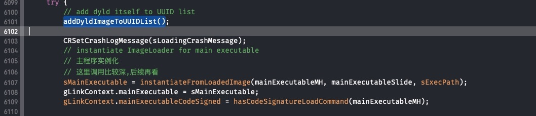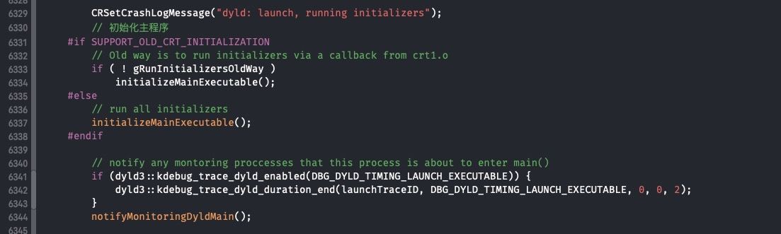 - 返回 main.m 的函数地址 接下来分析下dyld 的源码.