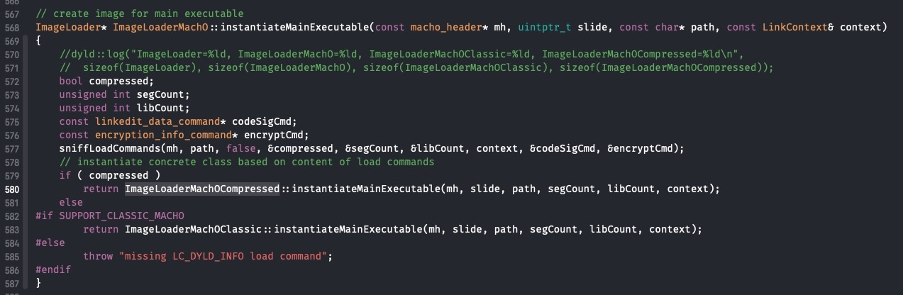 ImageLoader是一个抽象类,它的两个子类ImageLoaderMachOCompressed、ImageLoaderMachOClassic负责把 Mach-O 实例化为 Image.但要用哪个子类来进行实例化是通过sniffLoadCommands来判断Mach-O 文件的 LINKEDIT 是classic或者compressed.