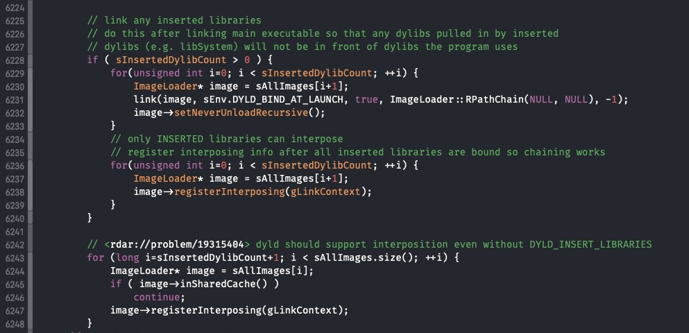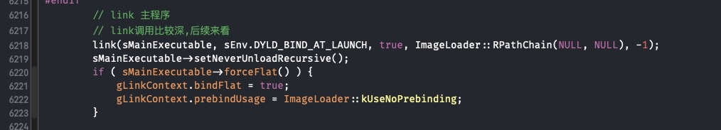 ImageLoader::link 函数,主要是做了加载动态库、rebase、binding 等操作,代码比较多,我就不贴了,在附件的源码上有我写的详细注释.
